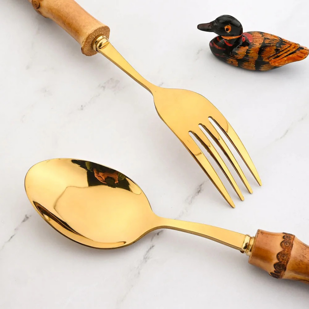 Conjunto de Talheres de 24 Peças com Cabo de Bambu em Aço Inoxidável