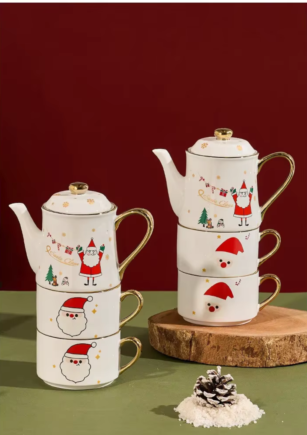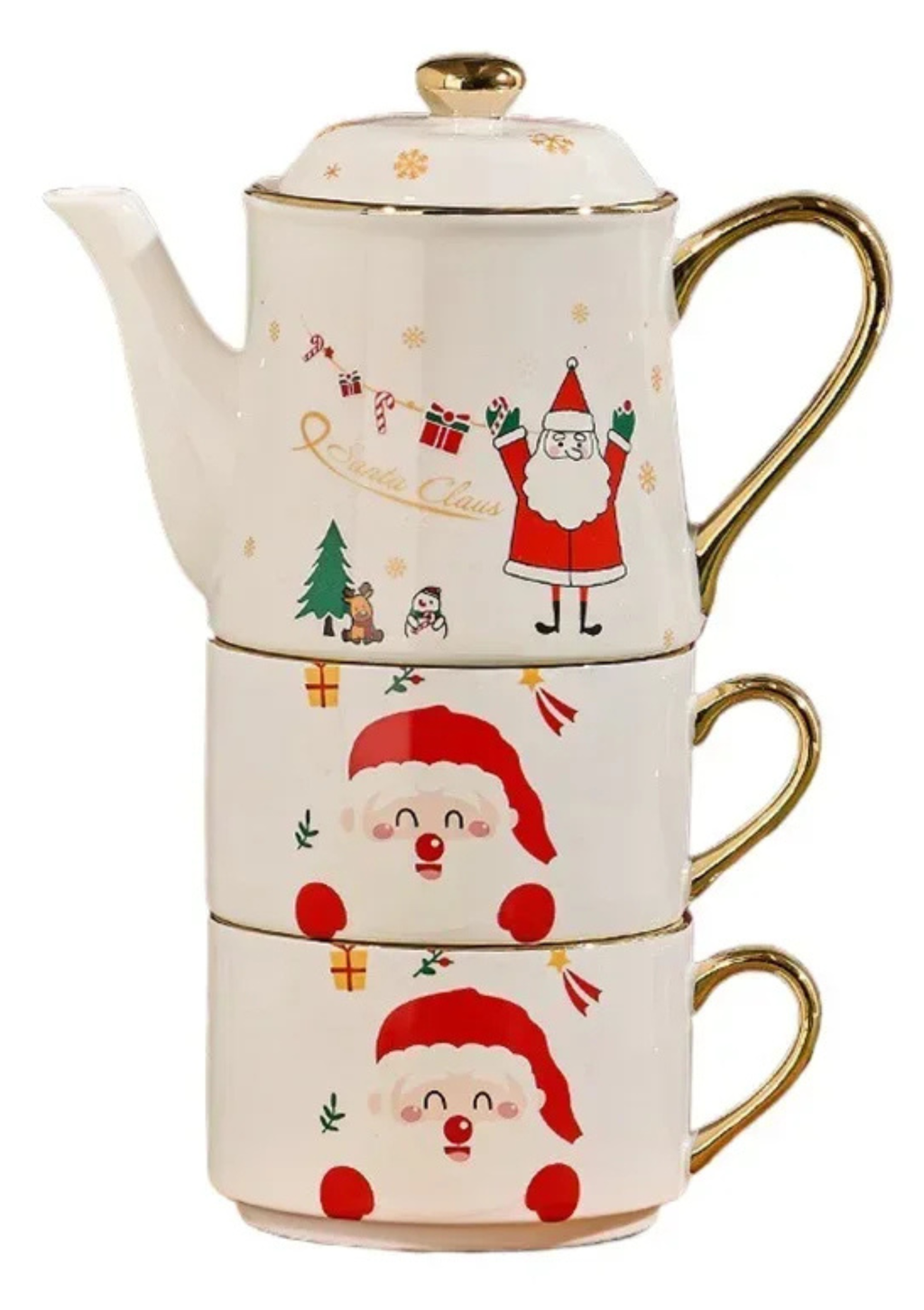 Inspirado nas cores e símbolos clássicos do Natal, o conjunto traz elementos decorativos de Papai Noel e árvore de Natal, com acabamento brilhante e pintura refinada. A alça dourada acrescenta sofisticação e faz da peça uma verdadeira joia de mesa posta, perfeita para encantar seus convidados.