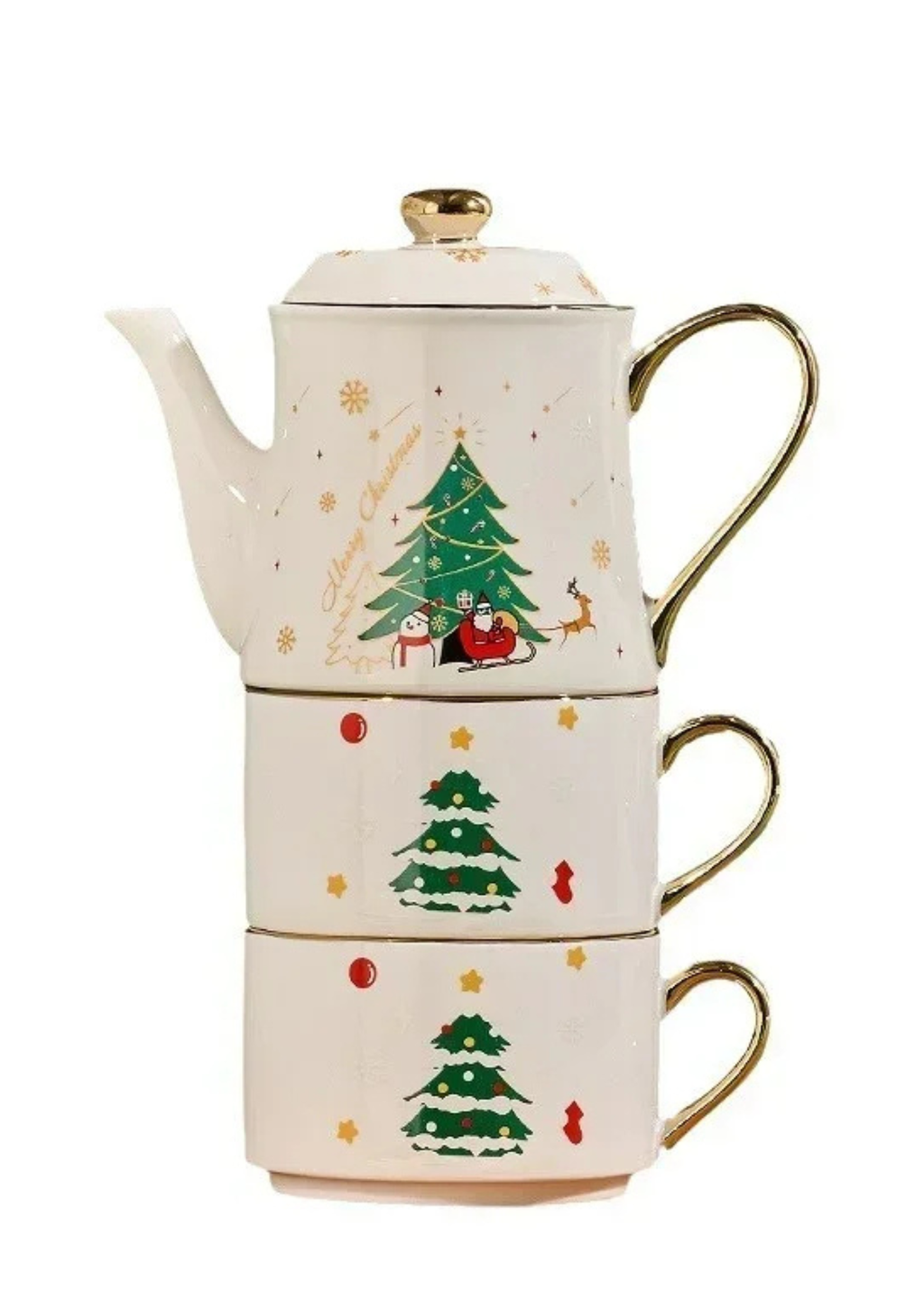 Composto por um bule e duas xícaras em cerâmica com alça dourada, ele é ideal para servir chá, café ou chocolate quente com requinte. Cada detalhe foi pensado para encantar — das curvas delicadas ao brilho sutil do dourado, refletindo a magia das festas de fim de ano.